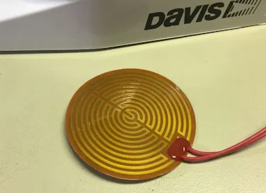 Ein Heizelement gibt ca. 13 Watt an Heizleistung ab. Dies ist deutlich mehr als erforderlich und daher werden die Elemente in Reihe geschaltet. Daraus folgt: Halbe Betriebsspannung je Element -> also 25 % der Leistung. In Zahlen ausgedrückt etwa 3 Watt pro Element. Dies reicht aus, um den Trichter vor Vereisung zu schützen. Lose Drähte werden mittels Heißkleber so fixiert, dass sie keinesfalls die Regenwippe berühren bzw. blockieren können.