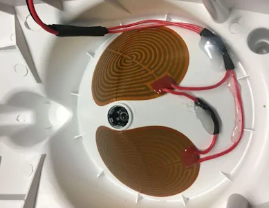 Damit der ganze Trichter beheizt werden kann, sind 2 Heizfolien erforderlich. Die Folien sind selbstklebend und werden wie gezeigt auf der Unterseite des Trichters