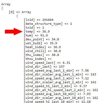 Die Antwort der Wetterstation kommt als Gesamtpaket im JSON-String und muss anschließend zerlegt werden, damit die Werte einzeln darstellbar sind, bzw. weiterverarbeitet werden können. Grundsätzlich gibt die Wetterstation die Messergebnisse mit amerikanischen Einheiten aus, die Temperatur in Fahrenheit, Windgeschwindigkeit in mph, Regenmenge in inch usw.